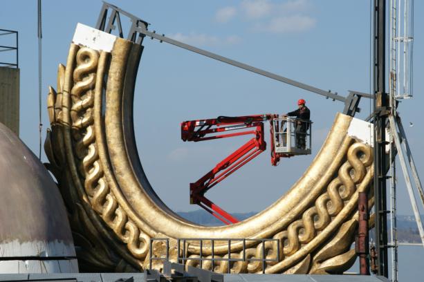 Aufgebaut wird das Bühnenbild für das Spiel auf dem See alle zwei Jahre auf Holzpiloten rund um eine fixe Konstruktion,