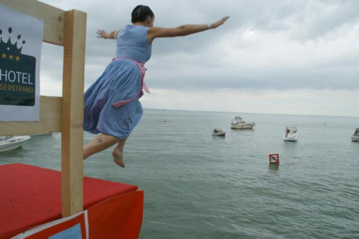 Von einem Podest auf dem Badehaus sprangen die "Dirndln" 4 Meter ins kühle Nass des Bodensees.